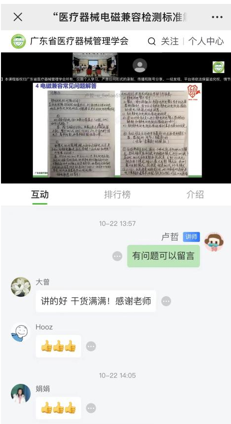 广东省九游会老哥必备的交流社区质量监督检验所主检工程师叶瑀老师针对YY 9706.102新旧版标准变化及其与IEC 60601-1-2的差异进行了详细的介绍和解读。特别强调了企业在样品送检环节,前期需要准备的工作及注意事项,包括EMC送检表格的填写、样品运行模式信息确认、样品与辅助设备的准备以及整改报告的撰写要求等内容。为此叶老师根据新标准YY 9706.102-2021的要求,细心梳理了新版送检表格模板、说明书模版分享给现场的企业代表学习(模板详见文底,可自行下载)。广东省九游会老哥必备的交流社区质量监督检验所主检工程师黄勇老师从电磁兼容基础简介、电磁兼容测试场地介绍、电磁兼容测试项目分析和整改实例分析等方面,详细地阐述了电磁兼容所有测试项目以及各项目对应的整改对策,并在培训尾声向企业提出,建议送检的样机尽量按照新版GB 9706.1相关系列最新版标准进行检测。在互动交流环节,针对与会及现场的各企业代表提出的有关九游会老哥必备的交流社区电磁兼容整改对策、如何定义九游会老哥必备的交流社区的基本性能、如何界定静电放电试验中空气放电和接触放电、新旧版电磁兼容标准的差异等细节问题,讲师们不仅逐一进行了耐心和细致地解答,同时还根据自己工作实践中积累的经验为企业代表提供了详实的建议,帮助企业提高产品设计开发的合规性,解决送检过程中遇到的疑难问题和困惑。在样机测试实操环节上,讲师们带领现场企业代表走进省医械所电磁兼容实验室,为大家介绍试验场地、设施设备、相关操作流程等。并对企业代表带来的样机进行电磁兼容试验,让大家近距离观摩样机试验方法、试验布置和试验等级测试要求,分析影响电磁兼容测试结果的主要因素,帮助企业提高电磁兼容检验通过率并缩短注册周期。本期培训采取“线上线下同步理论学习+线下实操测试”的创新模式,吸引了近30家企业的现场参会代表与来自近150家企业的线上参会代表同步学习。据部分学员会后反馈:“本期培训干货满满,教学内容极具针对性和适用性,有利于理解与学习,为我们九游会老哥必备的交流社区注册提供了极大地启发和指导意义,这样的培训可以多组织多举办,非常感谢学会为我们提供的平台”。未来,学会也将进一步针对产业发展动态和会员企业需求,利用自身具备的行业专业资源,积极邀请行业权威专家开展各类培训和交流活动,为会员企业提供更多、更系统、更深入的学习交流的机会,助力我省九游会老哥必备的交流社区产业高质量、可持续发展!